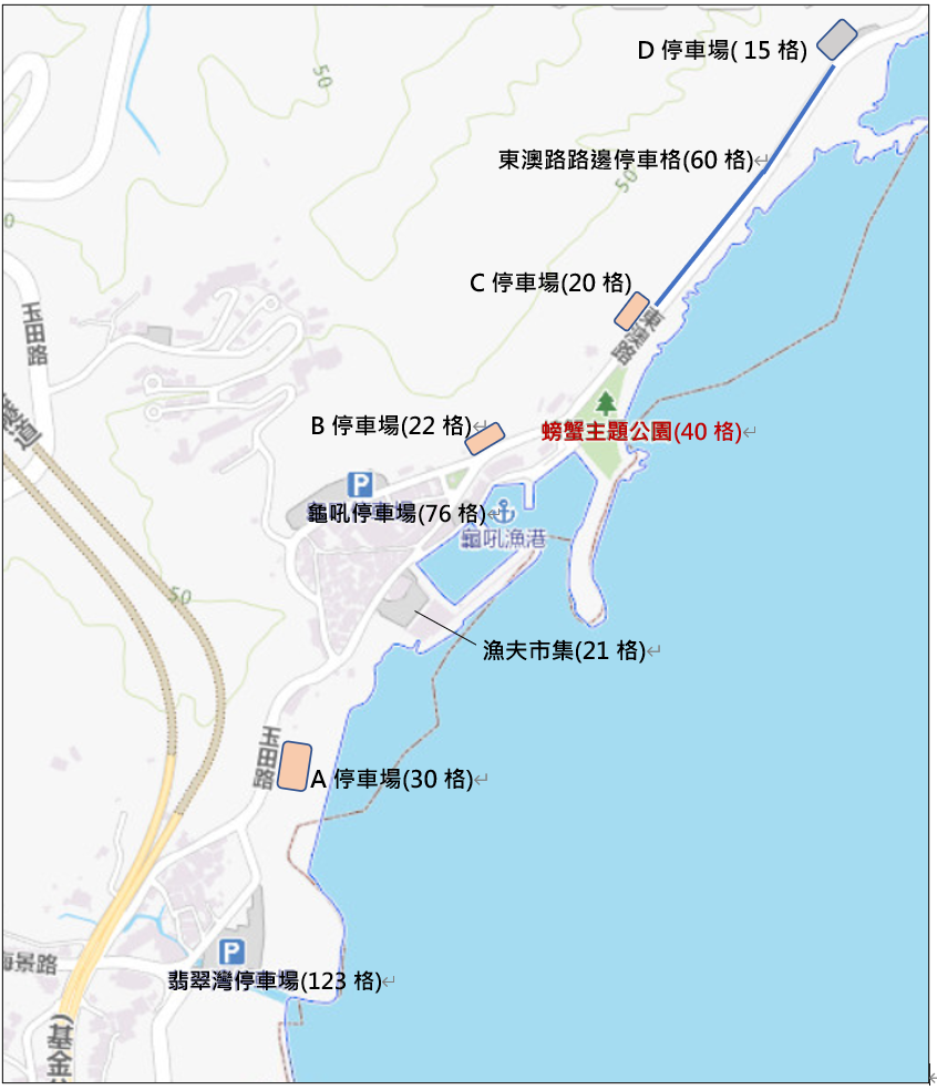 漁夫市集停車場、A停車場、B停車場、D停車場、東澳路路邊停車