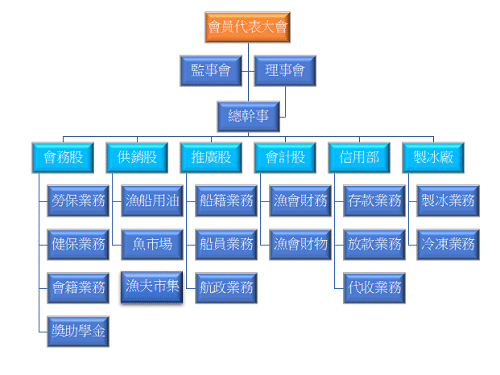 漁會組織架構由漁會會員(代表)大會、理事會、監事會、理事長、常務監事、漁民小組、總幹事組成。漁會理、監事由會員(代表)選任之,並由理事及監事互選一人為理事長及常務監事,另外漁會總幹事由理事會就主管機關遴選之合格人員中聘任之。會內部門可分為會務股、推廣股、供銷股、會計股、製冰廠以及信用部,編制員工共計35名(至本計畫書編制日期)。相關組織架構及各部門業務項目如下圖組織架構圖所示。